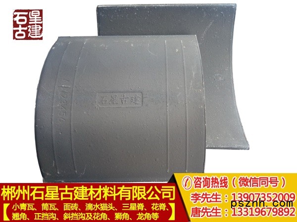 郴州石星古建材料有限公司,座落于森林之城,旅游之城—湖南省郴州市。毗邻5A旅游区东江湖、莽山森林公园、飞天山、世界非物质文化栖凤渡鱼粉发祥地栖凤渡镇。 郴州石星古建材料有限公司是湖南省大型古建材料厂,生产各种型号:小青瓦、筒瓦、面砖、滴水瓦、三星脊、翘角、正挡沟、斜挡沟及各种花角,狮角、龙角等。 本公司产品具有高强度、高密度、抗冻性好、不易产生裂纹等特点。广泛适用于古典园林、城墙建筑、古镇及风景区、小区道路、市政街面,城市广场等领域。 我公司本着真诚服务的宗旨,为文物古建筑提供优质的古建材料,我公司承接古建施工及配套工程,文物古建设计,全方位满足广大用户需求。| 规格 | 可定制 |